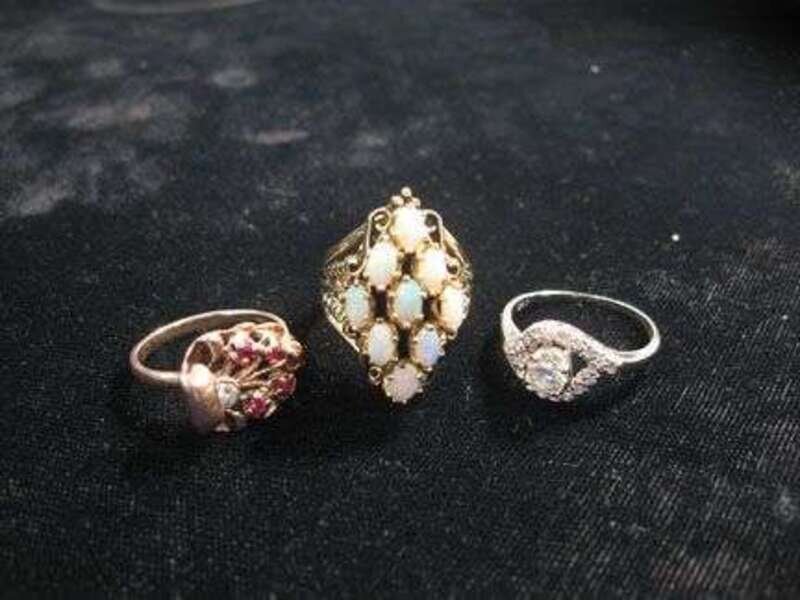 Three rings one set with nine oval opals in 14 karat gold, one 14 karat white gold ring accented by a central circular cut diamond surrounded by eighteen petite circular cut diamonds, and one 14 karat rose gold ring accented by five petite circular cut rubies and one petite circular cut diamond in leaf formation.