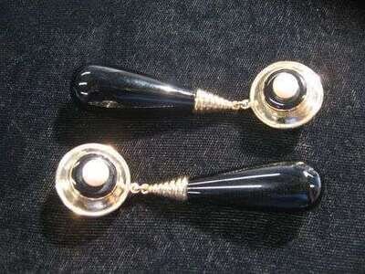 Yellow gold disk earrings each set with a single cultured pearl framed by onyx disk and terminating in an over-sized onyx drop.