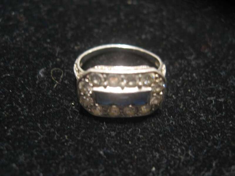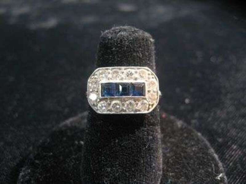 Filigree plaque set with petite round cut diamonds and French cut sapphires.
