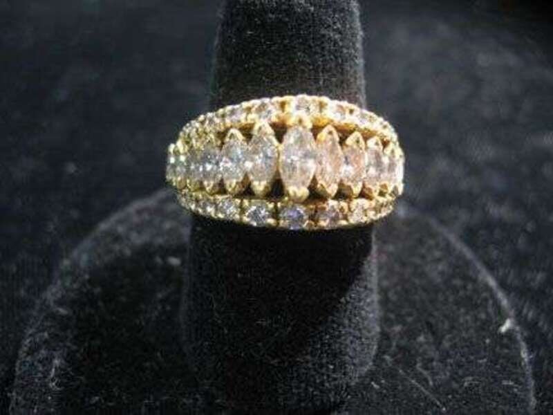 Thirteen graduating marquis cut diamonds framed by petite round cut diamonds.