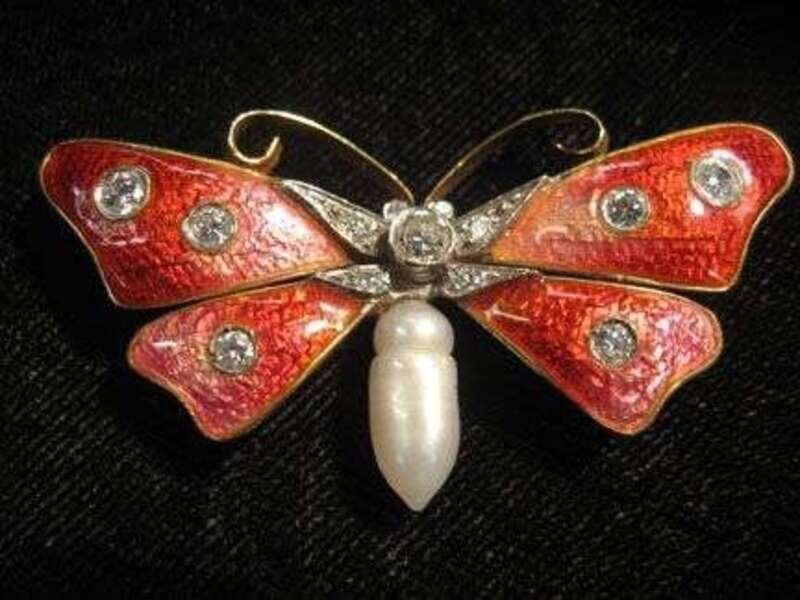 Pin and red enamel rings accented by three petite round cut diamonds on either wing, baroque pearl abdomen.