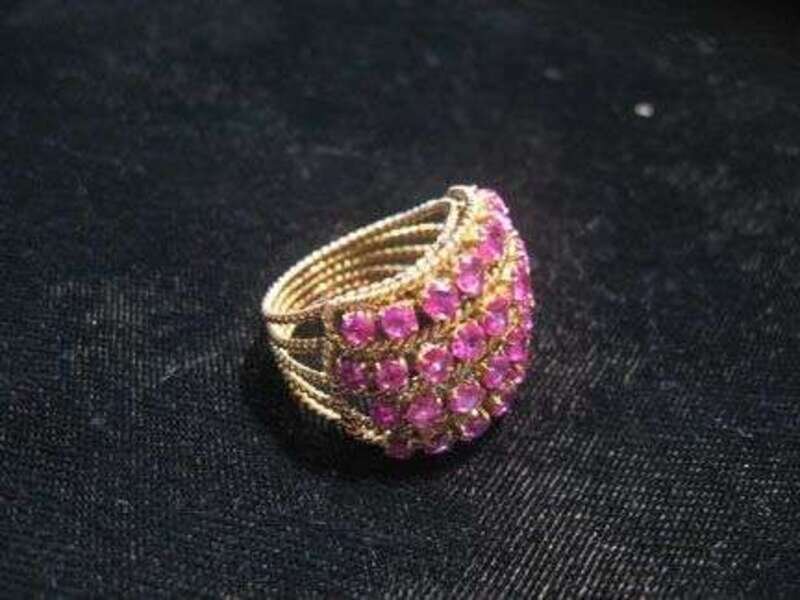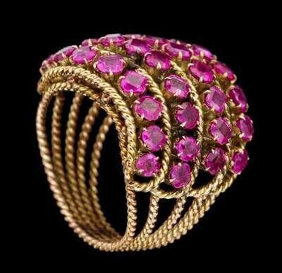 Yellow gold rope twist setting featuring four rows of square cut rubies, total ruby count is thirty-five.