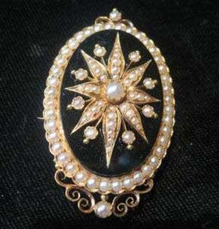 18 karat yellow gold onyx and seed pearl mourning style brooch victorian