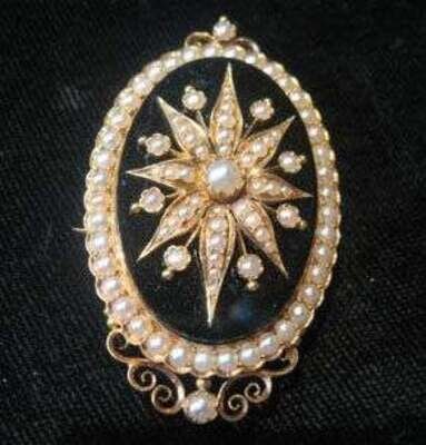 Oval onyx disk framed by seed pearls with applied yellow gold and seed pearl star. Can be worn as a brooch or pendant.