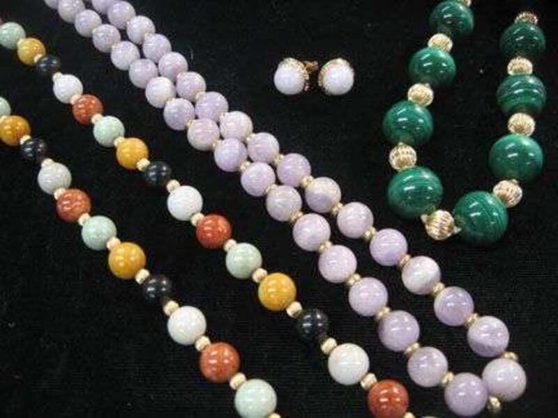 Group of three hard stone necklaces, and single pair of matching stud earrings