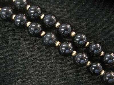 10mm onyx beads separated by yellow gold disks, 14 karat clasp.