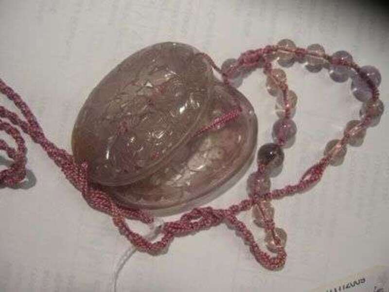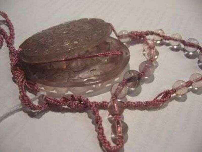 On a lavender cord with fifteen amethyst colored beads on braided silk cord.