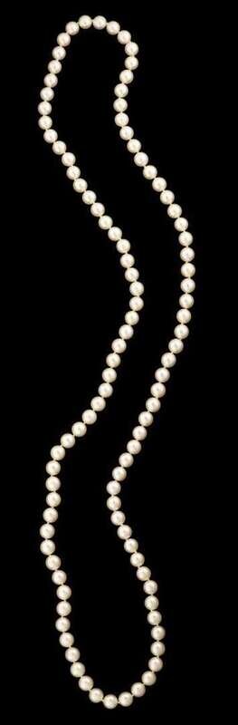 Traditional single strand of one hundred ten 8mm white luster pearls.