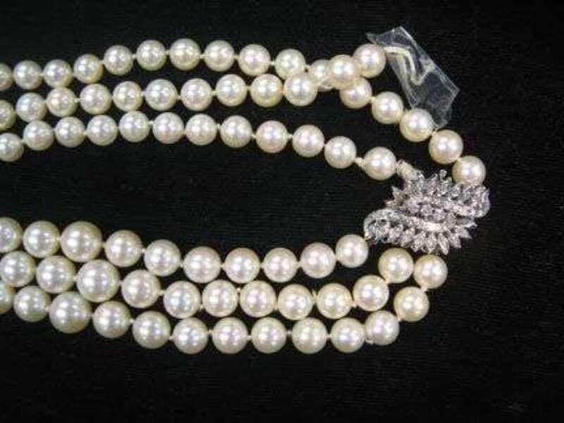 With large white gold and diamond clasp, 7.5-9mm pearls. Necklace is being sold as is, and currently has one broken strand.