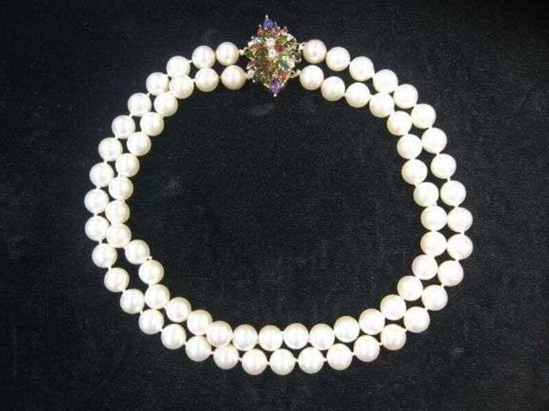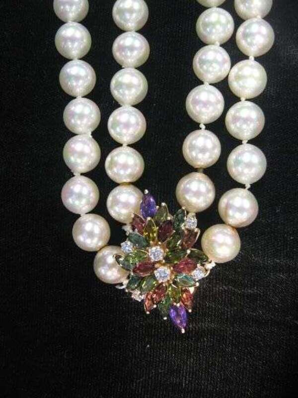 Faux pearl necklace with yellow gold and tourmaline diamond clasp