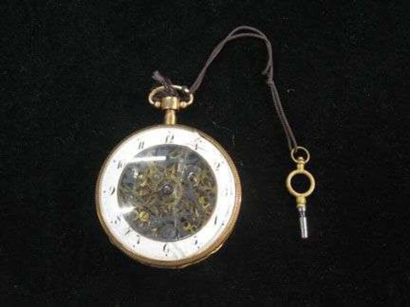 White enamel face with Arabic numeral and dash dial, skeleton face under dial. Key wind movement, in original box.