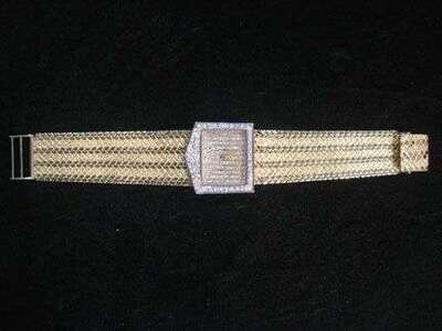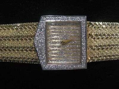 Pave diamond set face with woven 14 karat yellow gold band, quartz movement.