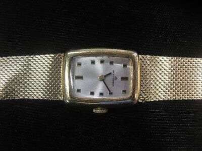 Rectangular cased silver tone face with dot/dash dial signed by Bucherer, case signed serial no. 5122. Woven yellow gold wristband.
