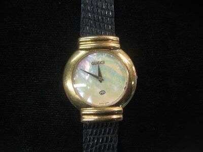 Mother-of-pearl face with numberless dial, black 'lizard' band, quartz movement, serial no.0010211.