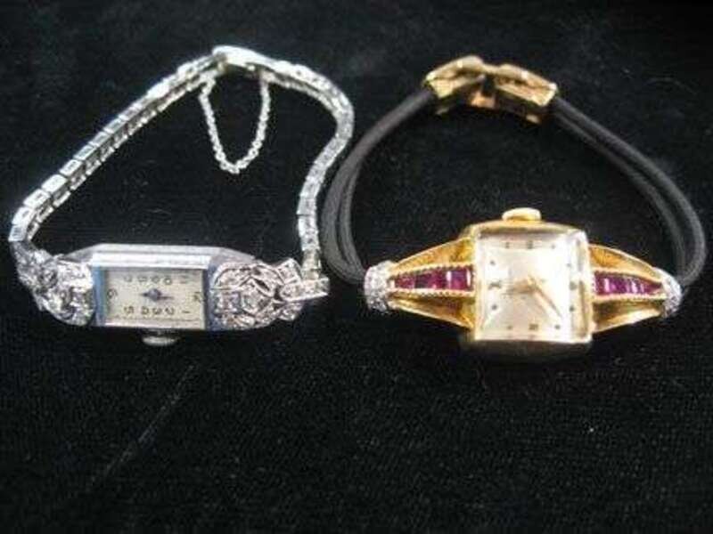 One 18 karat yellow gold cased ruby and diamond accented dress wristwatch by Gubelin on black silk cord band. The other 14 karat white gold cased Art Deco style watch accented by chip diamonds, white gold band accented by chip diamonds.