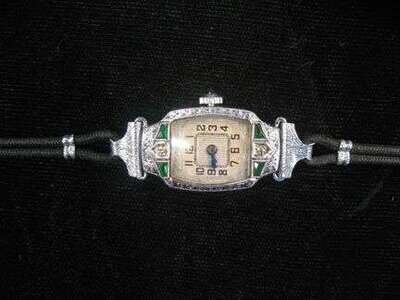 Petite white gold cased face with Arabic numeral and dash dial, with synthetic emerald and diamond frame around the face, black cord band accompanied by original box.