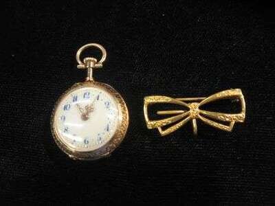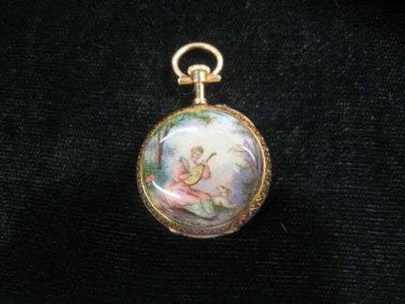White enamel face with blue Arabic numeral and dash dial, unsigned movement. Reverse displaying lady playing the lute with sheep. Accompanied by gold fill lapel hook.