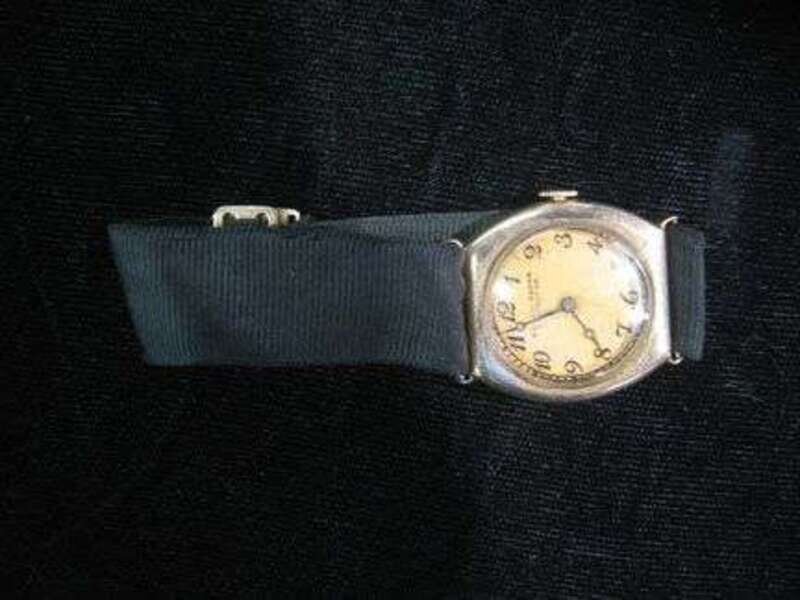 14 karat yellow gold case with yellow gold tone face displaying an arabic numeral and dash dial, signed by Bailey Banks and Biddle. Movement made by E. Huguenin, black ribbon band. Case etched June 12th, 1916.