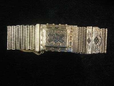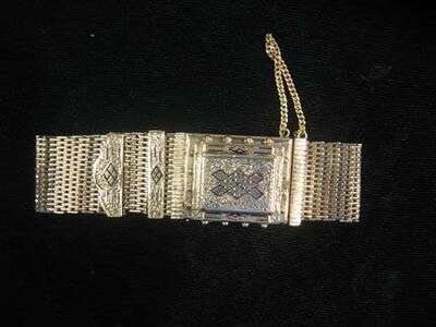 Mesh bracelet (7/8 in. wide), the case with cover is rectangular with black enamel highlights.