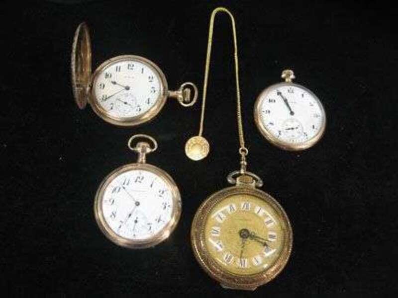 Three with Arabic numeral and dash dial with subsidiary seconds hand, two by Elgin and one by Waltham a fourth by Lexington with Roman numeral dial and gold fill chain. Three pocket watches appear to be running at this time, 5 pieces group.