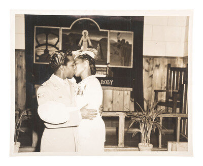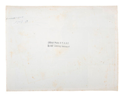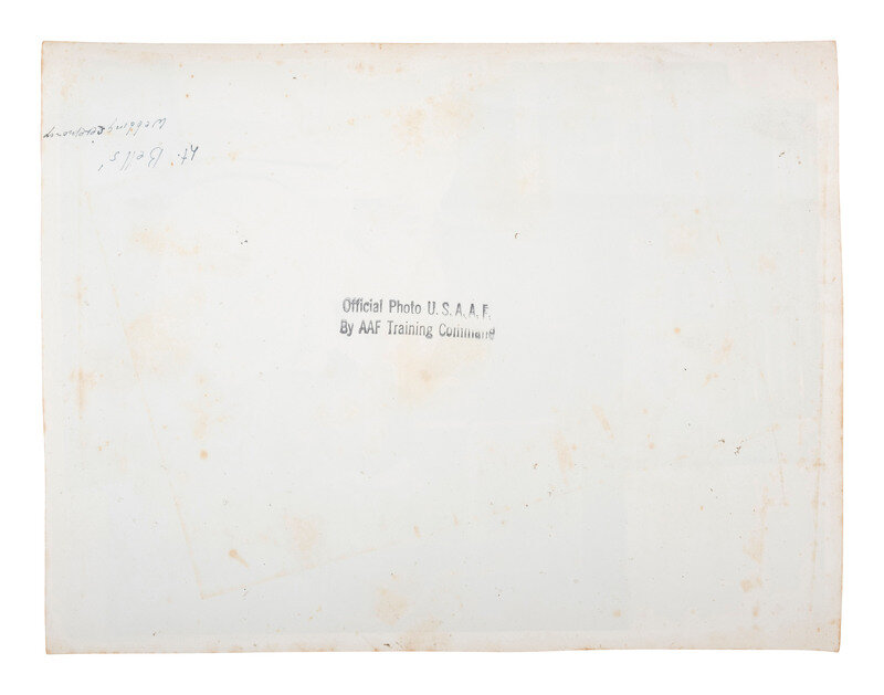 7 1/2 x 9 3/8 in. silver gelatin photograph (light edge wear). Verso annotated in ink, "Lt. Bell's wedding ceremony," with ink stamp, "Official Photo U.S.A.A.F., By AAF Training Command." A rare, possibly unpublished photograph providing a candid shot of Lt. Bell exchanging a kiss with his bride.