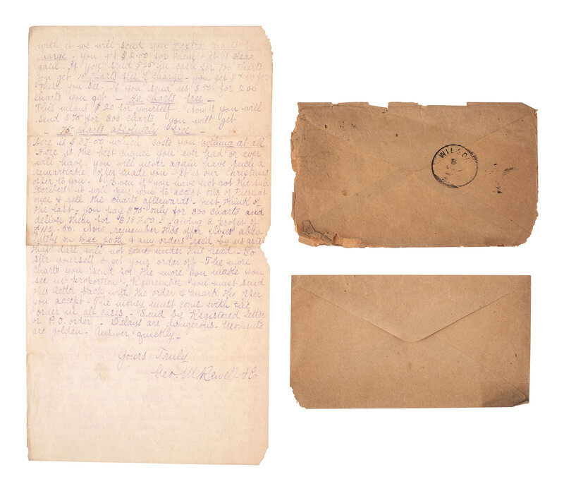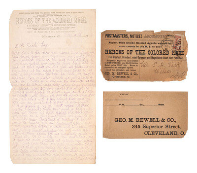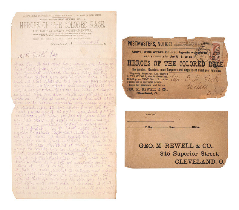 2pp, approx. 6 x 11 in. on "Heroes of the Colored Race" letterhead. Printed letter from "Geo. M. Rewell & Co." with handwritten notation "S.H. Vick Esq." above salutation. Accompanied by cover addressed to "Mr. S.H. Vick / Wilson / N.C." with boldly printed notice, "Active, Wide Awake Colored Agents wanted in / every county in the U.S. to sell / Heroes of the Colored Race / The Greatest, Grandest, most Gorgeous and Magnificent Chart ever Published" and by return envelope addressed to George M. Rewell & Co. at 345 Superior Street in Cleveland, Ohio.