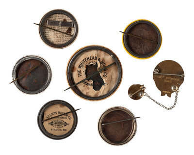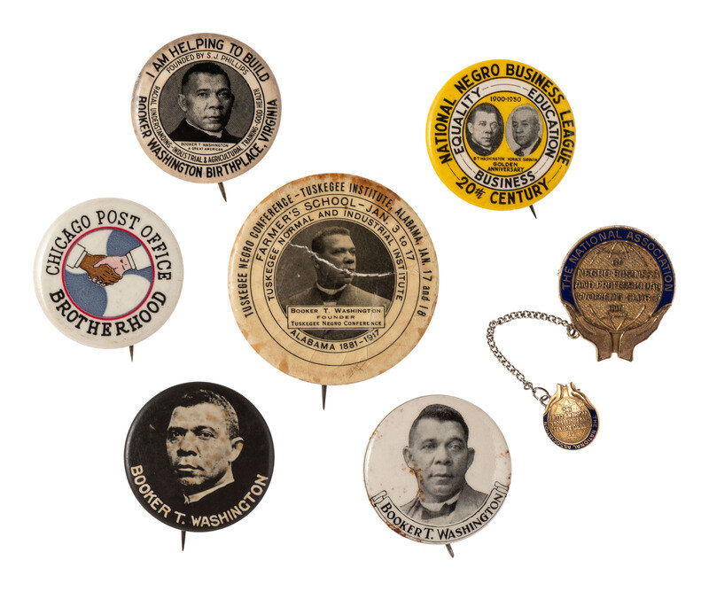 7 pinback buttons and badges, approx. 1 3/4 in. diameter and smaller, including: Tuskegee Negro Conference - Tuskegee Institute, Alabama, Jan. 17 and 18 / Farmer's School - Jan. 3 to 17. Featuring portrait of Washington at center. Newark, NJ: Whitehead & Hoag Co., n.d. (large separation through Washington portrait, crackling throughout, staining to edges). -- I Am Helping to Build / Booker Washington Birthplace, Virginia. Featuring portrait of Washington at center. St Louis, MO: St. Louis Button Mfrs., n.d. (darkening to edges). -- National Negro Business League / 20th Century / Equality Education Business. Featuring portraits of Booker T. Washington and Horace Sudduth at center. -- Chicago Post Office Brotherhood. Featuring an illustration of a white and black hand clasping at center. Chicago, IL: Acorn Badge Co., n.d. -- A membership badge for the National Association of Negro Business and Professional Women's Clubs Inc. -- And 2 others depicting Booker T. Washington.