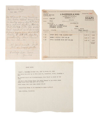 Papers constitute a typed letter from Ms. Omie Bradley to "Sweet Daddy" reporting financial expenditures for the period of 1 October 1957 to 24 March 1958. -- Manuscript letter, 1p, 24 November 1958, regarding "a special meeting" of "Sis Eula Miller." -- Invoice from J. Eavenson & Sons, manufacturers of soaps, showing purchase of "Daddy Grace Pine Scented Soap."