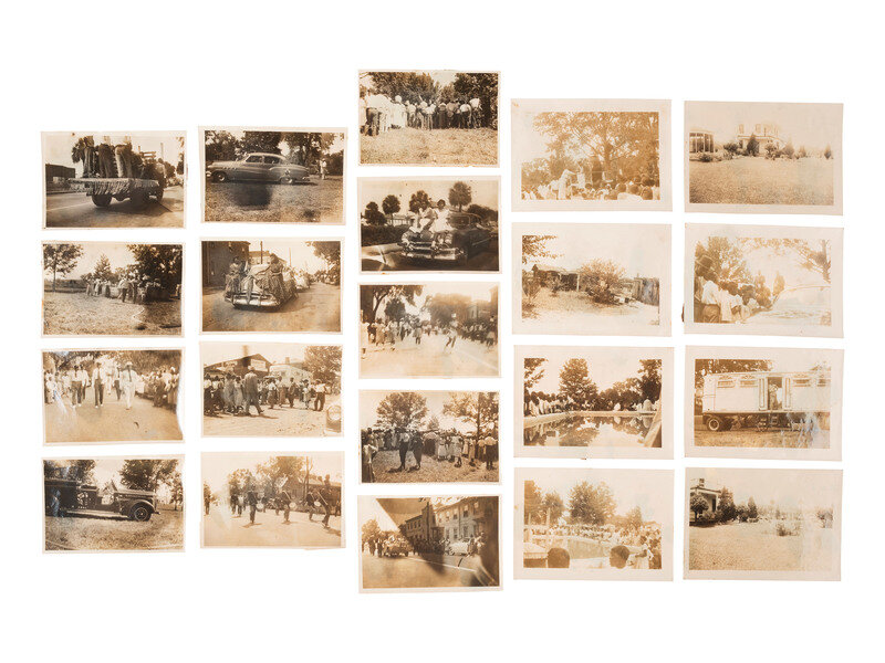 Consignor relates the snapshots show the city of Savannah, Georgia. One snapshot does contain a firetruck identified "Savannah" on its side. Most images appear to depict events as they unfolded at two separate occasions, both possibly associated with the House of Prayer's annual festive convocation which was a days' long celebration typically featuring worship, a group baptism, and a parade. At least six images show vehicles and individuals participating in a parade along a pedestrian-filled street, complete with a marching band, a truck decorated as a parade "float," and fancily attired females riding on cars in a procession. The second grouping contains at least eight images of a gathering, with one image showing a sign that reads "Convocation" on a large building in the background. Central in this grouping are images showing what appears to be a group gathered for a baptism to be undertaken in a large, water-filled vessel. The attendees wear white as was the tradition and encircle the vessel which has a wooden platform erected alongside it.