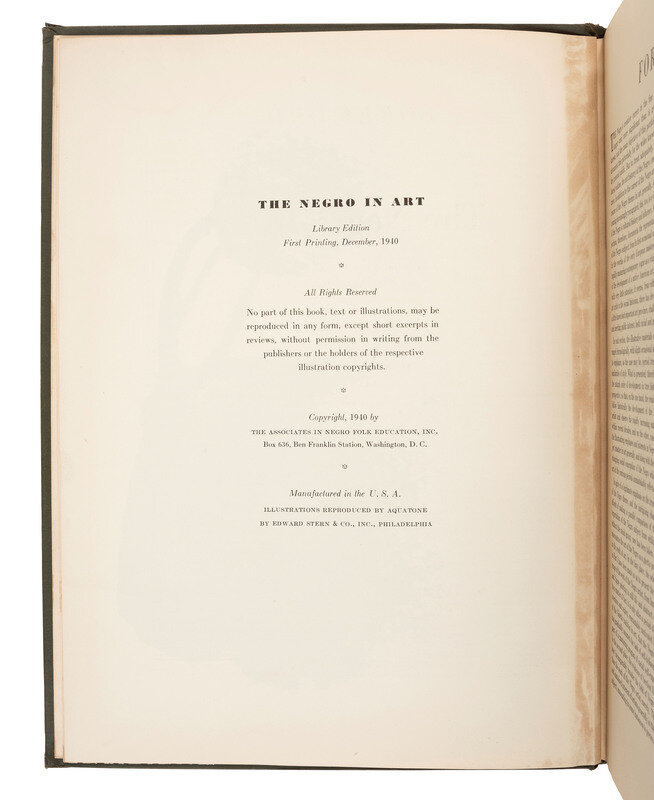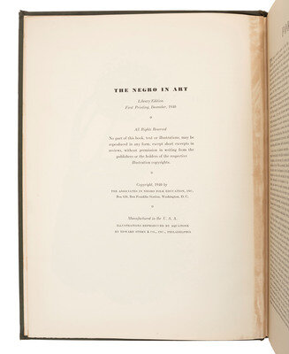 FIRST EDITION, FIRST STATED PRINTING (December 1940). The first full-length study of Black artists by Howard University Professor and key figure in the Harlem Renaissance, Alain Locke (1885-1954).