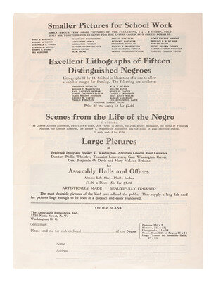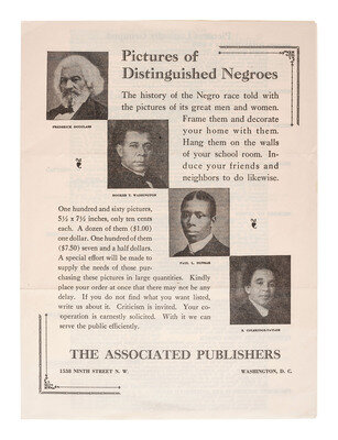 4pp, 8 1/2 x 9 1/2 in., on one folding sheet (creasing, folds, light wear). Front page featuring portraits of Frederick Douglass, Booker T. Washington, Paul L. Dunbar, and S. Coleridge-Taylor, and heralding "The history of the Negro race told with the pictures of its great men and women." The leaflet's interior lists the names of 160 prominent African American figures whose portraits were offered for sale, including "Negro Women of Distinction," "Negroes of Genius," "Prominent Negroes in the Antebellum Crisis," "Negro Statesmen," "Captains of Industry," "Negro Editors," and "Outstanding Negro Churchmen." Back page includes mail-in order form.