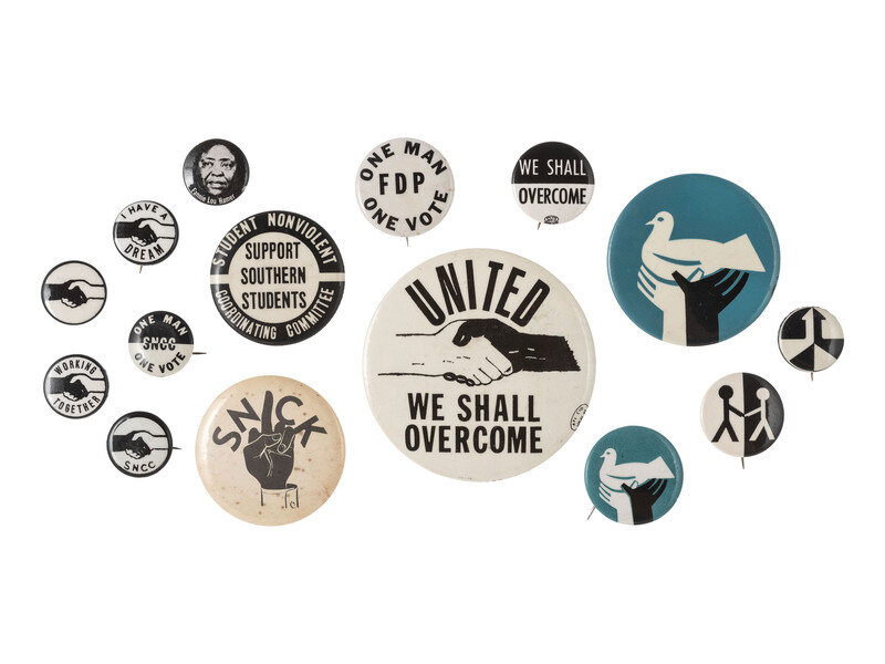 15 pinback buttons, approx. 3 1/2 in. diameter and smaller, including: 3 buttons identifying the SNCC by name, highlighted by "One Man, One Vote, SNCC." -- "United We Shall Overcome" button featuring a handshake between a white hand and Black hand. -- "One Man, One Vote, FDP" (Freedom Democratic Party). -- "We Shall Overcome." -- 2 anti-Vietnam War buttons featuring Black and white hands cradling a peace dove. -- Button featuring portrait of Fannie Lou Hamer, African American civil rights activist, cofounder (in 1964), and vice-chairperson of the Mississippi Freedom Democratic Party. -- And 5 others.