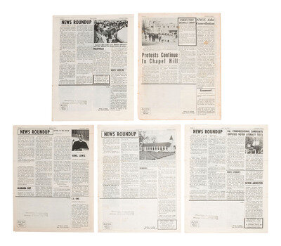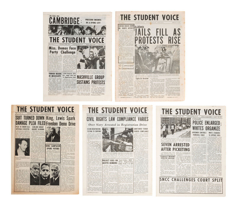Group of 5 issues, each 4pp, folio, 8 1/2 x 11 in. (toning, creasing, light soil), comprising: Vol. 5, No. 3, 27 January 1964, covering Atlanta and Chapel Hill protests, Freedom Day in Hattiesburg [MS], and more; Vol. 5, No.11, 19 May 1964, covering Cambridge, Maryland, and Nashville, TN protests, "Terror" in Mississippi, and more; Vol. 5, No.12, 26 May 1964, covering Mississippi's increased militarization in response to SNCC's plans for "Freedom Summer," and more; Vol. 5, No. 16, 15 July 1964, covering Selma protests, Civil Rights Act compliance, Mississippi news, and more; and Vol. 5, No. 18, 29 July 1964, covering MLK and John Lewis in Mississippi, an Alabama lawsuit, and more.