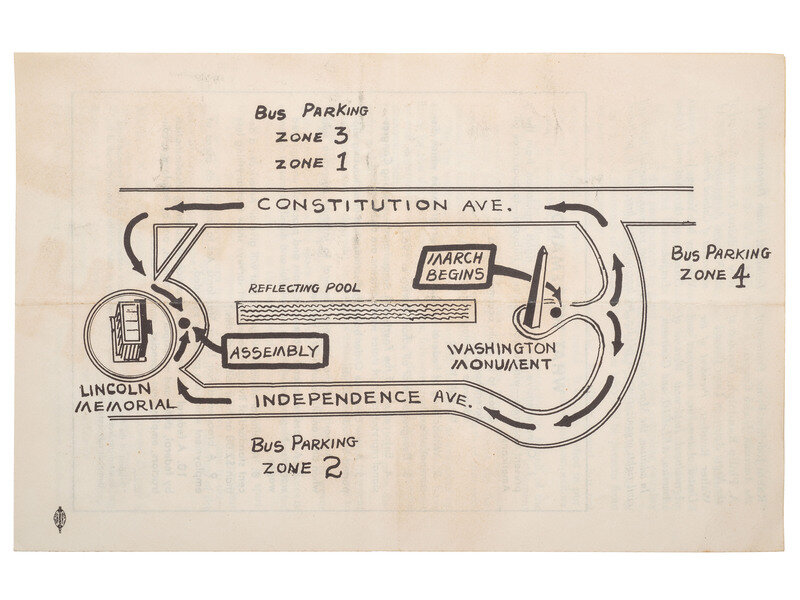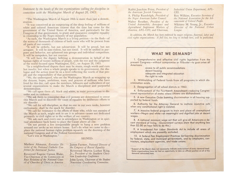 A program issued to participants, the front page features the schedule of events including the National Anthem led by Marian Anderson, a Tribute to Negro Women Fighters for Freedom by Mrs. Medgar Evers, remarks by John Lewis, Whitney M. Young, Jr., and Dr. Martin Luther King, Jr. The program's interior includes a "Statement by the heads of the ten organizations calling for discipline in connection with the Washington March" and a list of 10 demands. The last page features a map with a route of the march.