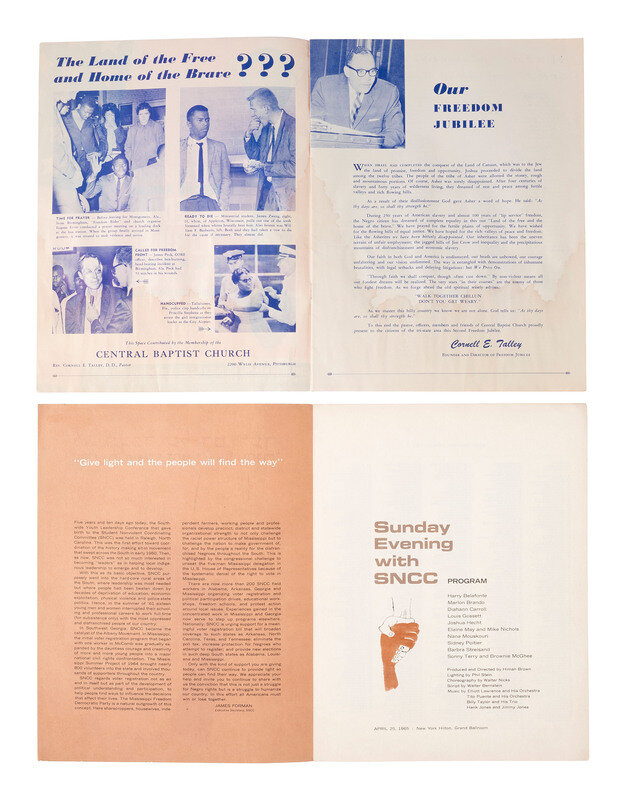 Sunday Evening with SNCC. New York Hilton, New York, NY, 25 April 1965. 4pp, 11 x 8 1/2 in. program, front cover with quote, "Thou Shalt Not Stand Idly By..." accompanied by artwork produced by Ben Shahn. Participants included Harry Belafonte, Marlon Brando, Sidney Poitier, and Barbara Streisand.