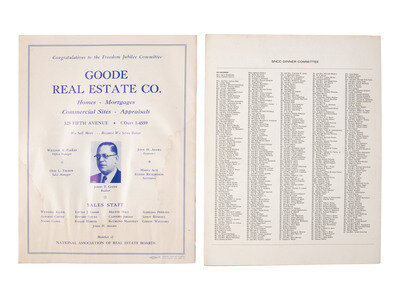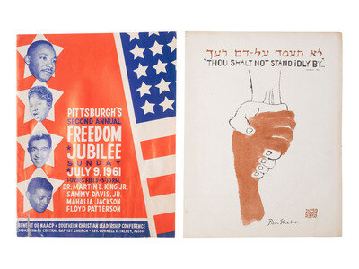 Pittsburgh's Second Annual Freedom Jubilee. Benefit of NAACP and Southern Christian Leadership Conference. Forbes Field, Pittsburgh, PA, 9 July 1961. 24pp, 10 7/8 x 8 1/2 in. program (some staining throughout, edge wear). The front cover illustrates featured participants, including Dr. Martin Luther King, Jr., who delivered the address, as well as Sammy Davis, Jr., Mahalia Jackson, and Floyd Patterson. In addition to the order of events, the program includes a lengthy list of patrons and advertisements promoting several local businesses.