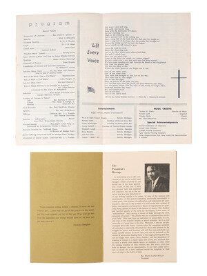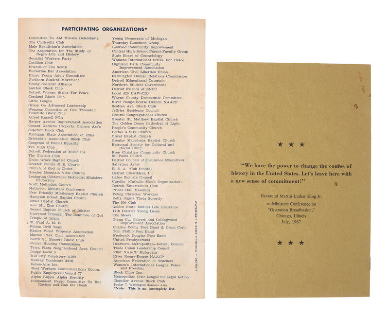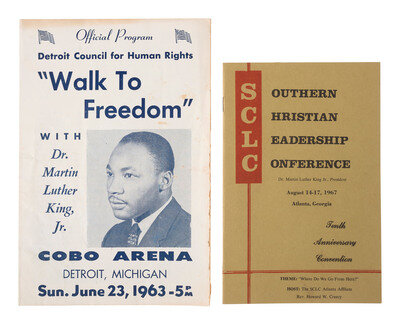 Official Program. Detroit Council for Human Rights. "Walk to Freedom" with Dr. Martin Luther King, Jr. Cobo Arena, Detroit, MI, 23 June 1963. 8pp, 9 1/4 x 6 1/8 in. program (toning, occasional soiling, light edge wear). Featuring portrait of Dr. King on the cover, who was the principal speaker at the event. Organized by Reverends Clarence L. Franklin (father of Aretha Franklin) and Albert Cleage, the Detroit Walk to Freedom was organized to bring attention to the "intolerable conditions" in which African Americans had been living in Detroit. The march drew a crowd of over 125,000 people and was considered to be the largest civil rights march in history to that point. It was also considered by many to be a precursor to the March on Washington, which took place two months later.