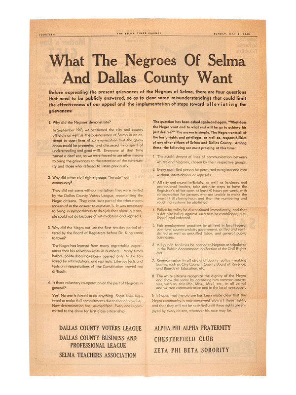 [AFRICAN AMERICANA]. "What the Negroes of Selma and Dallas County Want." The Selma Times-Journal. Selma, Alabama, 2 May 1965.