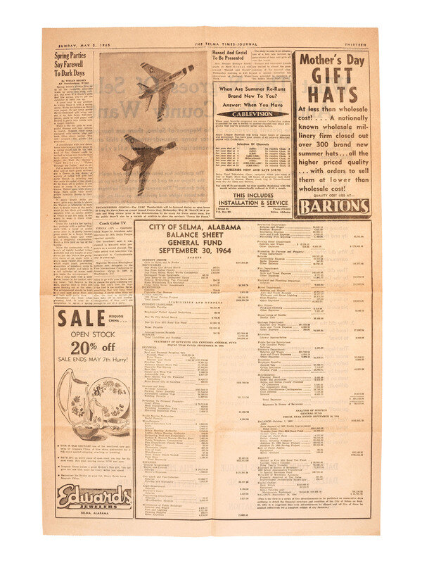 1p, approx. 15 1/2 x 23 1/2 in. (toning, creasing, generally good overall). Full-page statement "expressing the present grievances of the Negroes of Selma" published in a Sunday edition of The Selma Times-Journal and signed in type by the Dallas County Voters League, Dallas County Business and Professional League, Selma Teachers Association, Alpha Phi Alpha Fraternity, Chesterfield Club, and Zeta Phi Beta Sorority.