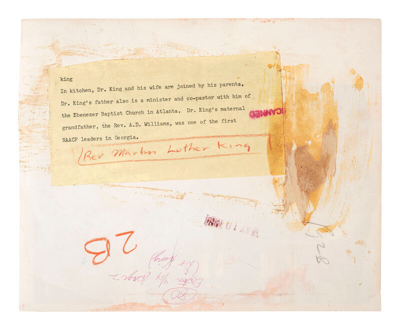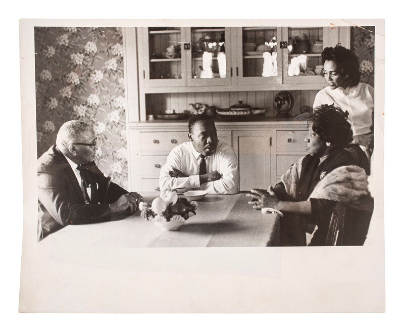 8 x 10 in. silver gelatin photograph (edge and corner wear, including some creased corners, residue and staining on verso). Ink stamps and typed caption affixed to verso, which reads, in part, "In kitchen, Dr. King and his wife are joined by his parents. Dr. King's father also is a minister and co-pastor with him of the Ebenezer Baptist Church in Atlanta..."