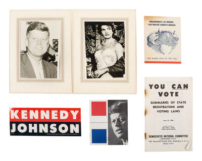 Also included are a collection of documents pertaining to the 1960 Presidential Campaign of John F. Kennedy including: "Students for Kennedy-Johnson Victory Manual" issued by Dick Murphy, Kennedy-Johnson Campaign Coordinator for Young Voters Activity detailing how to establish campaign clubs, how to debate, and how to handle publicity and advertising for the campaign. Item includes a further letter from Richard P. Murphy dated 1 September 1960, laying out arguments for securing the votes of America's college students. Also included are a campaign pamphlet entitled "Kennedy: Leader for the 60s", "Prosperity at Home Can Insure Liberty Abroad: The Major Issue in the 1960's", "You Can Vote: Summaries of State Registration and Voting Laws" issued by the Democratic National Committee, and a folio containing a publicity photograph of John F. Kennedy and portrait photo of Jacqueline Kennedy.