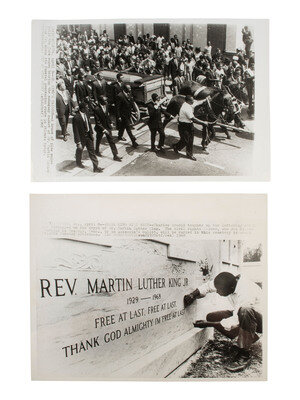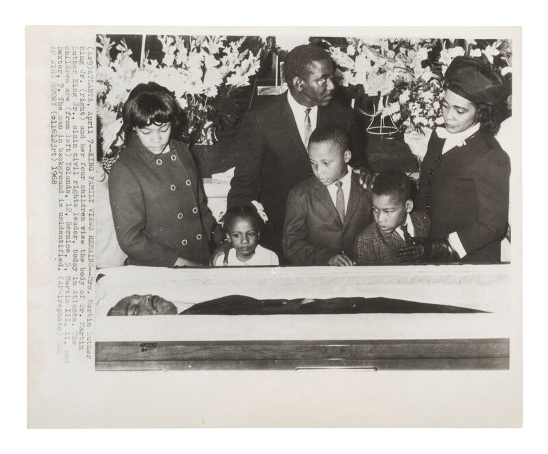 [KING, Martin Luther, Jr. (1929-1968)]. A group of 3 press photographs documenting Dr. King's funeral, incl. Coretta Scott King and her four children viewing the body of the slain civil rights leader. Atlanta, GA, 12 April 1968.