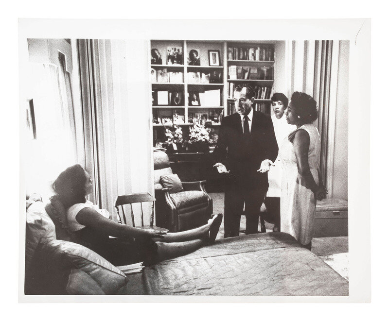 8 x 10 in. silver gelatin photograph (light edge/corner wear, light ink mark/smudge near top right corner). Ink stamp and typed Associated Press Photo label partially affixed on verso, with title, "As Nixon Visited Mrs. King," and accompanying details about the scene: "An exclusive picture of Richard Nixon in the Atlanta Home of Mrs. Martin Luther King Jr...Picture was taken by the Rev. Robert Fitch, a former colleague of Dr. King in the Southern Christian Leadership Conference who lived in the King home at one time."