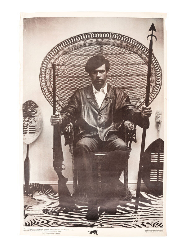 Iconic poster of Huey Newton seated on fan-backed chair with spear and rifle in hand.