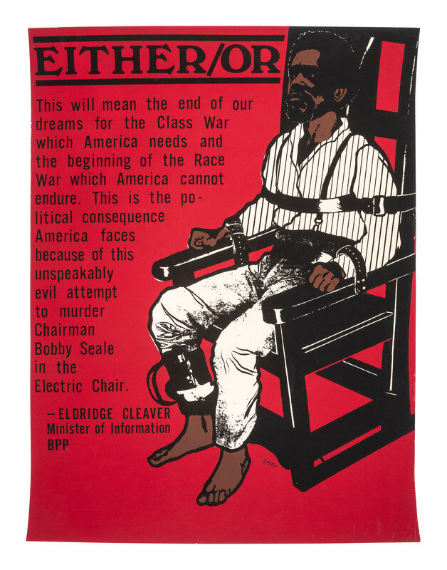 Full text: "Either/Or This Will Mean the End of Our Dreams for the Class War which America needs and the beginning of the Race War which America cannot endure. This is the political consequence America faces because of this unspeakably evil attempt to murder Chairman Bobby Seale in the Electric Chair. / Eldridge Cleaver, Minister of Information BPP."