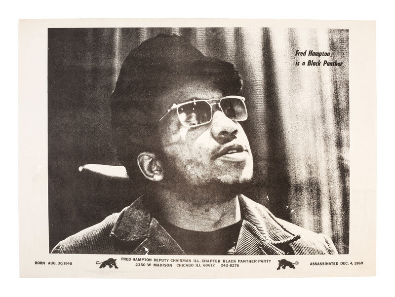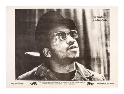 18 x 25 in. poster (small scattered punctures/holes in paper with the largest to Hampton's jacket lapel near lower margin, light creasing and few short tears to edges and corners). Poster commemorating the death of Fred Hampton, featuring a halftone image of Hampton wearing sunglasses and gazing upward, along with text reading "Fred Hampton is a Black Panther" within image. Text below image reads, "Born Aug. 30, 1948 / Assassinated Dec. 4, 1969," while text flanked by two illustrated black panthers lists Hampton's position as deputy chairman of the Illinois chapter of the Black Panther Party along with the party's Chicago address.