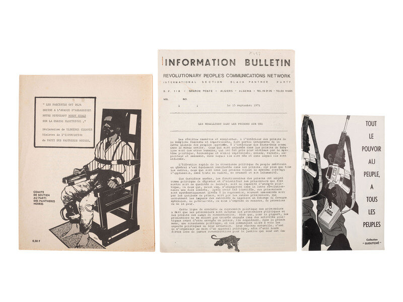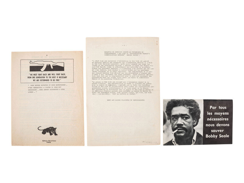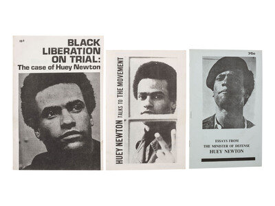 Essay from the Minister of Defense Huey Newton. 8vo (5 3/4 x 9 in.) Staple-bound original illustrated wrappers (minor wear). Contains articles taken from Huey P. Newton's columns in The Black Panther newspaper. -- Huey Newton Talks to The Movement. [Chicago, IL]: [Students for a Democratic Society], 1968. 8vo (6 x 9 in.) Staple-bound original illustrated wrappers (minor wear). Contains excerpts from an interview of Huey Newton by the newspaper, The Movement. -- ROSEBURY, Celia. Black Liberation on trial: The Case of Huey Newton. Berkeley, CA: Bay Area Committee to Defend Political Freedom, 1968. 8vo (6 3/4 x 10 in.) Contains coverage of the trial of Huey Newton. -- And 3 publications in French related to the Black Panthers including 2 pamphlets titled Tout le Pouvoir au Peuple, A Tous Les Peuples and Declaration de Eldridge Cleaver Ministre de l'Information du Parti des Pantheres Noires, and an information bulletin from the Revolutionary People's Communications Network dated 15 September 1971. -- Together, 6 pamphlets and publications related to the Black Panthers.