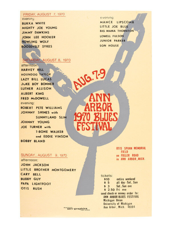 Aug. 7-9 Ann Arbor 1970 Blues Festival. Ann Arbor, MI: Seri-Graphics, [1970]. 22 x 14 in. poster (light soiling to margins, light edge and corner wear). Central to the poster is an illustration of a large chain. Red and black text throughout announces festival schedule with performers, location, and ticket information.
