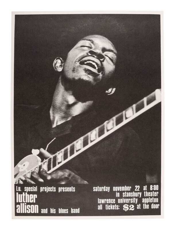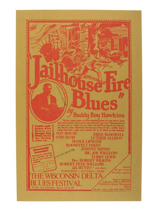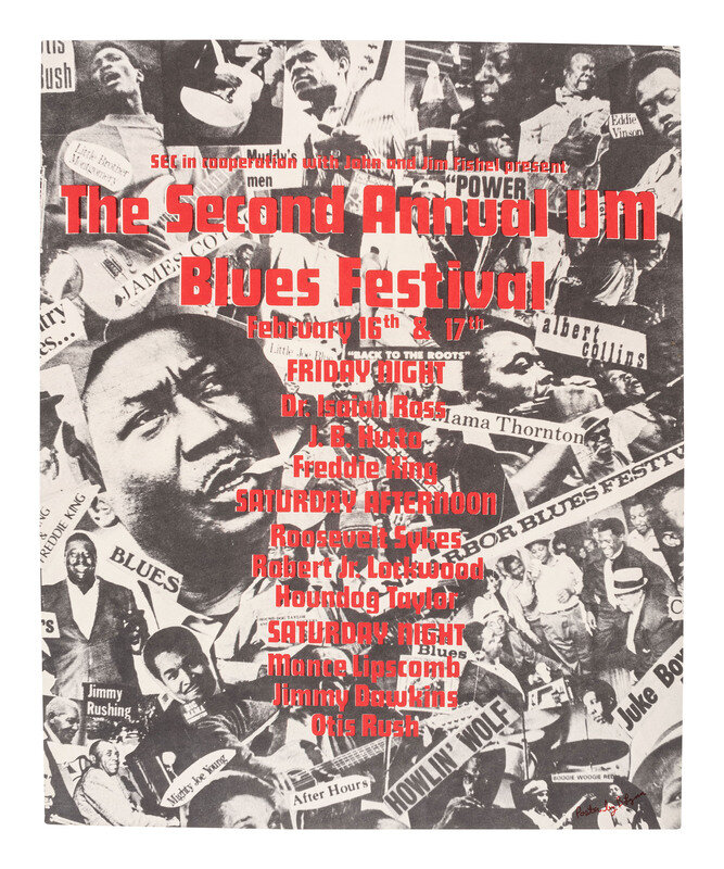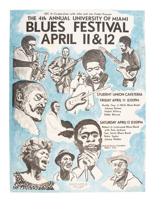 [With:] LYNN, B., artist. The Second Annual UM Blues Festival. [Miami, FL]: University of Miami, 16 & 17 February [1973]. 18 1/2 x 15 in. poster (minimal wear). Featured acts include Dr. Isaiah Ross, J.B. Hutto, Roosevelt Sykes, Robert Jr. Lockwood, and Otis Rush. -- AMDUR, David, artist, New York. The 4th Annual University of Miami Blues Festival. [Miami, FL]: University of Miami, 11 & 12 April 1975. 21 1/2 x 16 in. poster (some soiling to margins). Featured acts include Buddy Guy, Jr. Wells Blues Band, Johnny Shines, Robert Jr. Lockwood Blues Band with Fats Jackson, and Jimmy Walker. -- "Jailhouse Fire Blues" by Buddy Boy Hawkins...The Wisconsin Delta Blues Festival. Beloit, WI: Beloit College, 27 & 28 March n.y. 18 1/2 x 12 in. poster (very good). -- Luther Allison and his blues band. [Appleton, WI]: [Lawrence University], 22 November n.y. 23 x 17 in. poster (light edge wear).