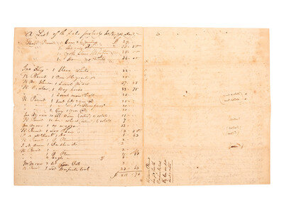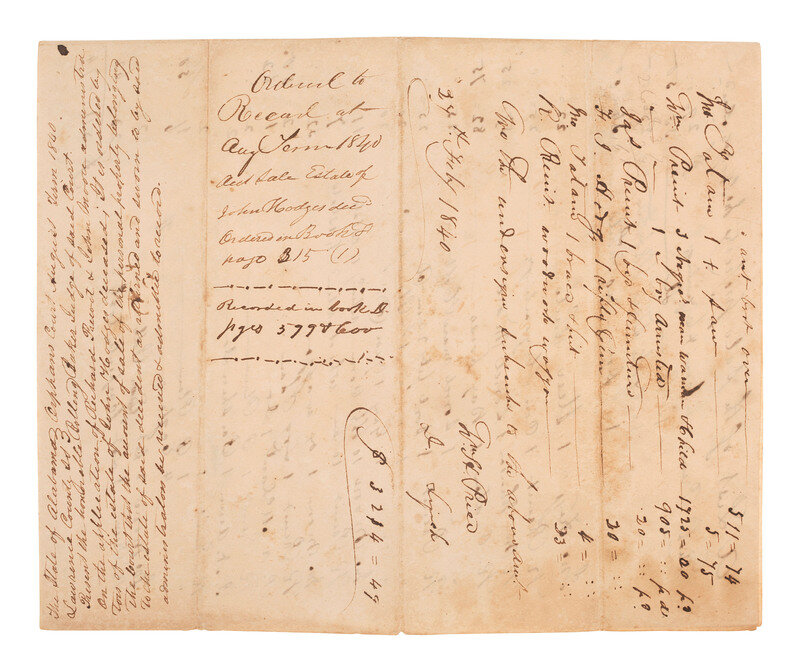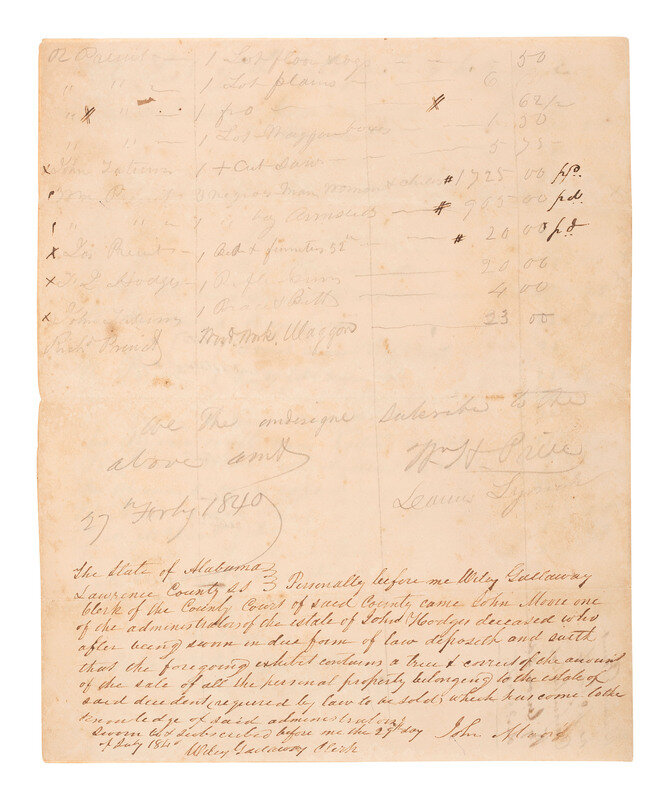 "A List of the Sold property of Jno. S. Hodges Decd." 4pp, 8 x 10 in. (toning, light soil, creasing). Docketed verso, by clerk of Lawrence County, 29 July 1840.